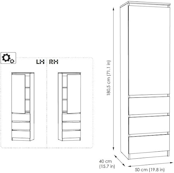 - TECHNICAL DETAILS: Material: 16 mm thick furniture board. Matte surface. Width: 50 cm, Height: 181.5 cm, Depth: 40 cm. Suitable for indoor use. Drawers mounted on roller rails. The doors can be mounted on the left or right.